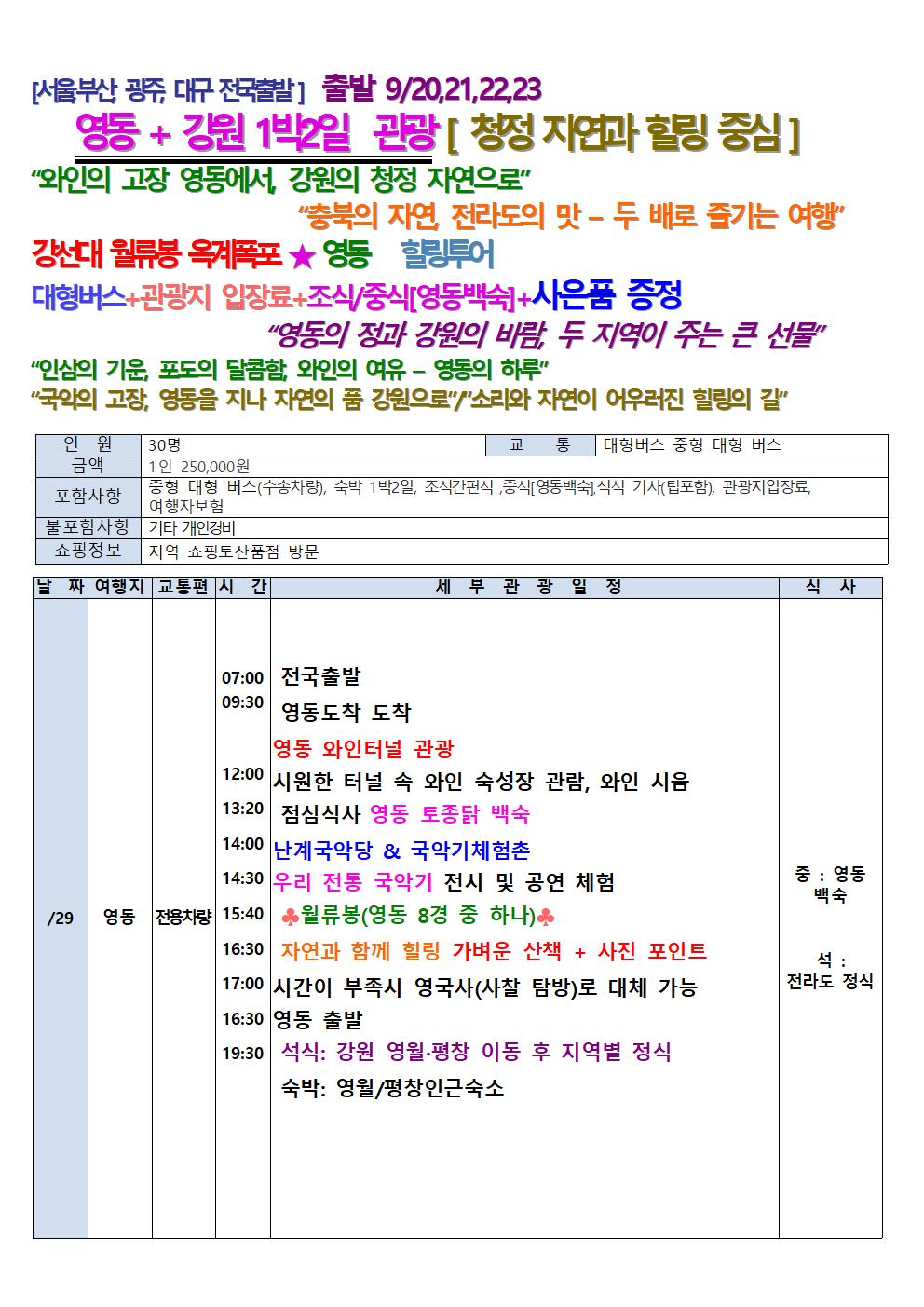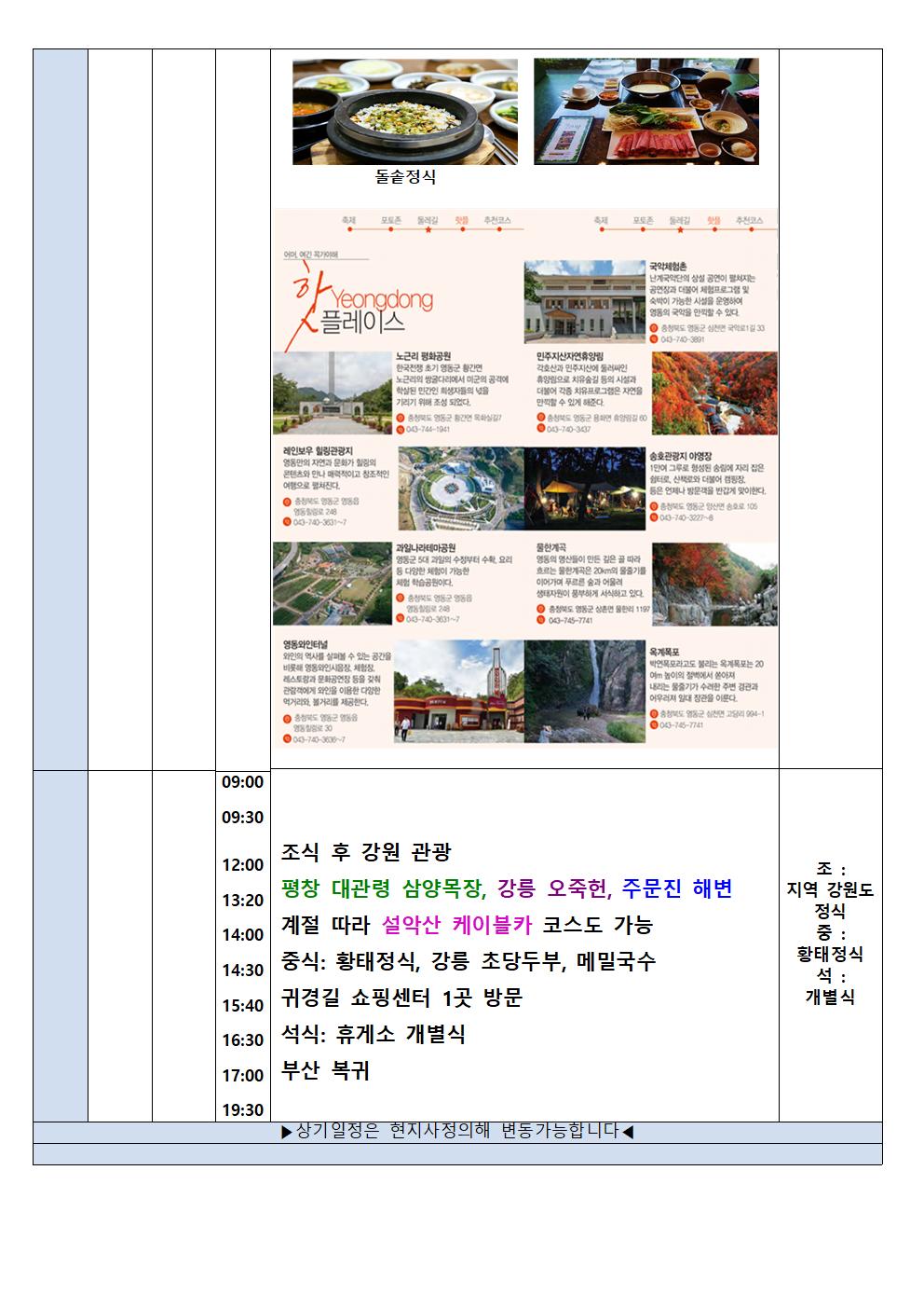 중형 대형 버스(수송차량), 숙박 1박2일, 조식간편식 ,중식[영동백숙],석식 기사(팁포함), 관광지입장료, 여행자보험