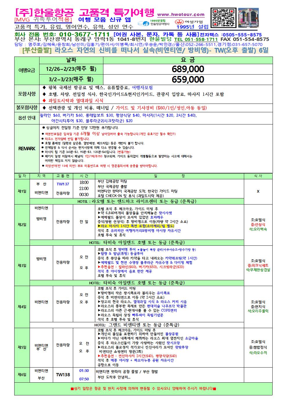 [부산 출발] 라오스 천혜의 자연 속 힐링 6일 우리 함께 느끼며 떠나보세요!!!- 티웨이 항공- 실속(비엔티안/ 방비엥)